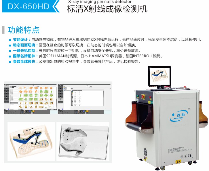 功能特點(diǎn):DX-650HD X光鞋子驗(yàn)針機(jī),是一款標(biāo)清的X光驗(yàn)針釘設(shè)備,適合用于鞋子手袋箱包等工業(yè)生產(chǎn)質(zhì)量檢測(cè)場(chǎng)所,是檢品環(huán)節(jié)一款重要的檢測(cè)儀器。